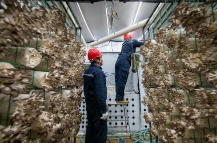 廊坊公司員工在固安縣牛駝鎮秀珍菇生產基地走訪,檢查生產大棚內的照明線路(鄒明攝)