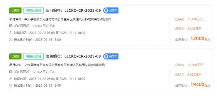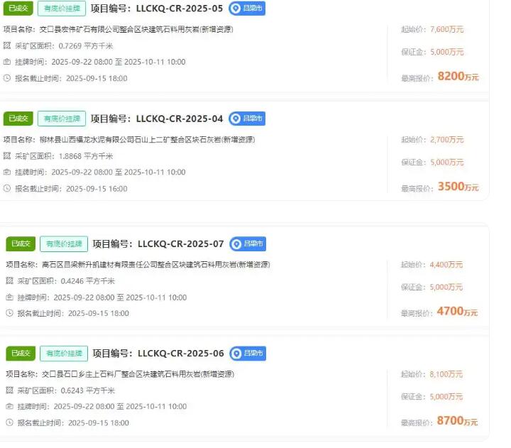 其余5宗砂石礦均由山西本土民營企業競得,礦種以建筑石料用灰巖(新增資源)為主,單礦資源儲量從5856萬噸到近2.4億噸不等,擬出讓年限最長達29.7年,資源價款統一穩定在0.8元/噸左右。