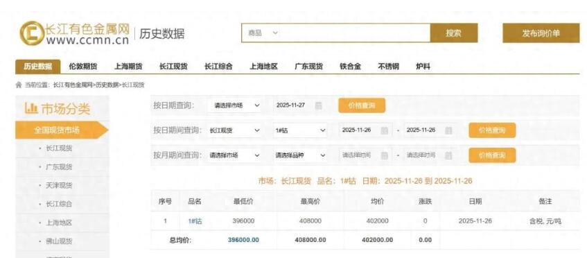 從年初的16.9萬元/噸到如今逼近40萬元/噸大關,鈷價一路扶搖直上。進入11月,鈷價的上漲勢頭不但沒有減弱,反而愈發強勁。11月10日,長江現貨1# 鈷均價單日暴漲6000元,報收396000元/噸。截至11月26日,長江現貨1# 鈷現貨報價為區間價396000~408000元/噸,均價402000元/噸,持續在40萬元/噸大關附近高位運行。