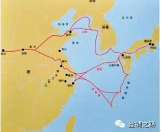 東海起航線最早始自周武王滅紂,建立周王朝時,他封箕子到朝鮮,從山東半島的渤海灣海港出發,到達朝鮮,教其民田蠶織作。中國的養蠶、繅絲、織綢技術由此通過黃海最早傳到了朝鮮。中日兩國之間一衣帶水,通過朝鮮半島或經由日本海環流水路,交往十分方便。日本自古以來就有關于蠶業的傳說。據日本古史記載,西漢哀帝年間,中國的羅織物和羅織技術已傳到日本。隋代,中國的鏤空版印花技術再次傳到了日本。隋唐時期,日本使節和僧侶往來中國頻繁,日本至今仍沿用中國唐代的名稱,如:絞纈、臘纈、羅、綢、綾、羽等。宋代也有很多的中國絲綢被運往日本。明代則是日本大量進口中國絲綢的時期,這一時期,日本從中國輸入的生絲、絹、緞、金錦等不計其數。清朝則從順治到雍正施行了四十年的海禁。清廷的閉關鎖國政策完全阻礙了清國與西方世界的接觸,使清國喪失了與世界同步發展的最佳時期,為后來清國百年積弱落后埋下伏筆,清廷則有不可推卸的責任。明初鄭和下西洋時,海上絲綢之路發展到巔峰。鄭和之后的明清兩代,由于實施海禁政策,中國的航海業開始衰敗,這條曾為東西方交往做出巨大貢獻的海上絲綢之路也逐漸消亡了。 直到1784年,美國“中國皇后”號訪粵,標志著美國直達廣州的航線的開通。