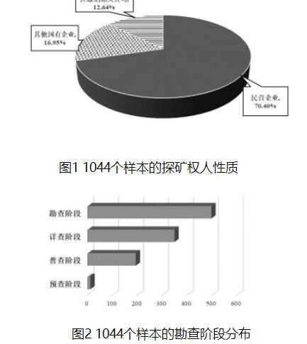 抽樣統計的1044個探礦權中,有735個為民營企業(包括民營企業控股的混合企業)持有,占比70.4%;國有地勘單位及其控股的相關公司持有132個;其他國有企業(包含國有控股混合企業)持有177個(見圖1)。這反映出,目前我國大部分探礦權歸屬民營企業。這些民企絕大多數以自然人名義投資,大部分企業規模不大,注冊資本幾十萬元到幾百萬元。投資勘查找礦的民企類型也呈多樣化,樣本中有房地產公司、文化傳媒公司、農業公司、貿易公司、科技公司等,反映出我國礦業仍有很大的投資吸引力,同時也反映出我國礦產勘查并非由專業勘查公司來開展,并缺少西方國家通過證券市場或投資基金來融資的渠道,礦產勘查投資市場體系尚不完善。