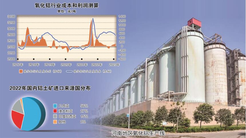 “伴隨電解鋁供給側改革及晉豫礦山整頓,氧化鋁上游原料采購成本提升,下游需求增長受限,市場產能過剩問題不斷加劇,行業利潤近年來也十分低下,晉豫地區近半數產能虧損已成為常態。”單貴斌稱,雖然2021年后受電解鋁市場帶動,氧化鋁價格一度大漲使行業利潤創出歷史高點,但持續時間并不長。2021年11月后,國內氧化鋁價格從4100元/噸的歷史高位逐步下跌,截至2023年5月,氧化鋁價格已跌至2800元/噸左右。