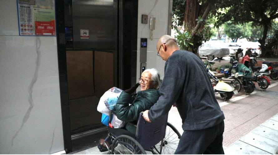 1月24日,在深圳龍崗區(qū)龍城街道長(zhǎng)江花園小區(qū),坐在輪椅上的業(yè)主魏玉霞在使用加裝的電梯。新華社記者李思佳 攝