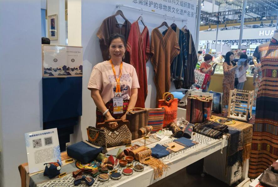 以傳統(tǒng)黎錦技藝開發(fā)出的文創(chuàng)產(chǎn)品亮相展臺。新華社記者趙葉蘋 攝