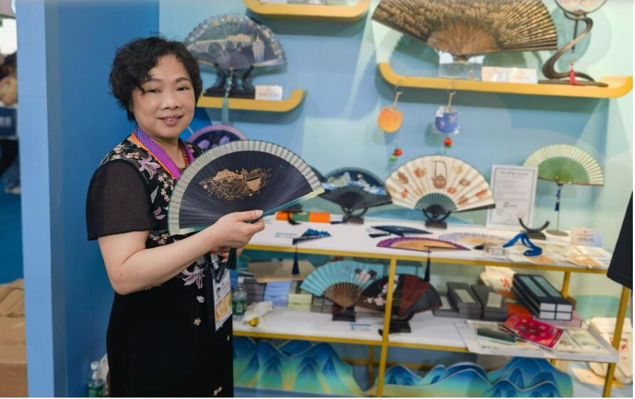 消博會上充滿現(xiàn)代元素的傳統(tǒng)竹扇。新華社記者趙葉蘋 攝