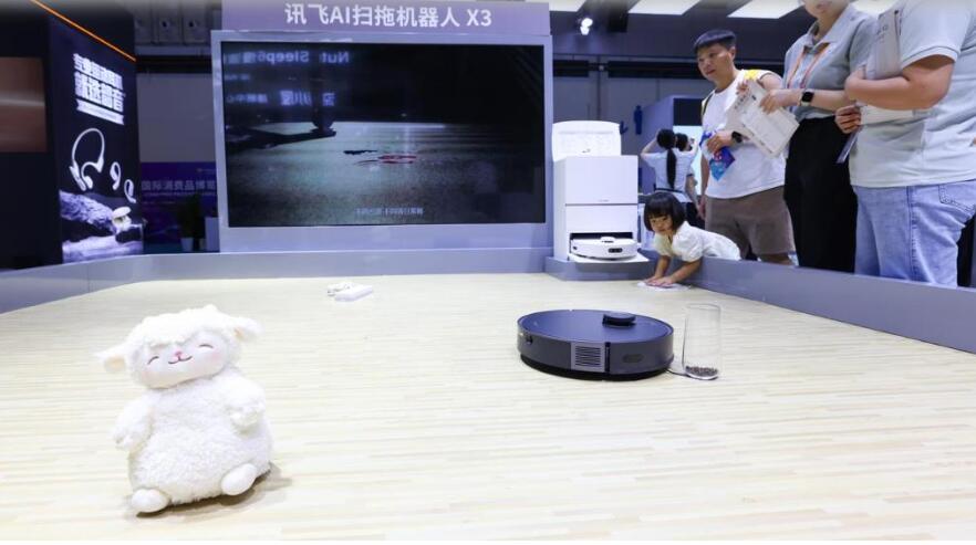 在1號館數(shù)字和服務(wù)消費展區(qū),科大訊飛股份有限公司一款“說哪到哪”“指哪掃哪”的AI掃拖機(jī)器人引來眾多客商駐足。該產(chǎn)品在行進(jìn)過程中遇到液體污漬會自動倒車清掃、先拖后掃。