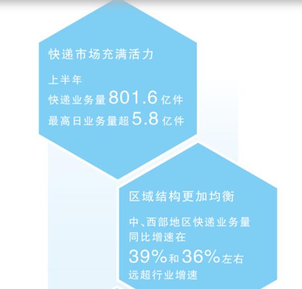 看發(fā)展動力,上半年,快遞市場充滿活力、運行良好,最高日業(yè)務量超5.8億件。