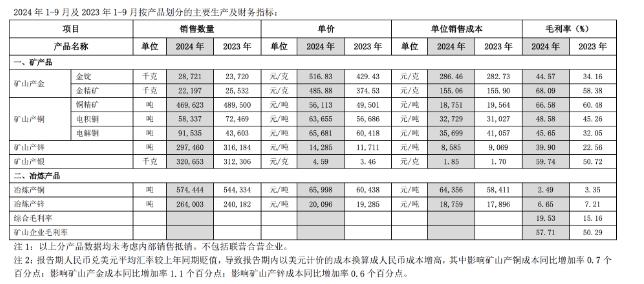 今年1-9月,紫金礦業礦產金54噸、礦產銅79萬噸、礦產鋅31萬噸,分別同比增加8%、同比增加5%、同比下降4%。礦山企業毛利率為57.71%,同比增加7.42個百分點;綜合毛利率為19.53%,同比增加4.37個百分點。