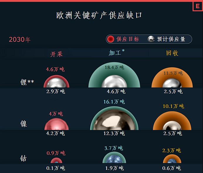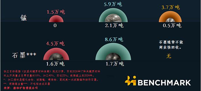 從礦產(chǎn)品加工看,歐盟本土鋰加工量有望達(dá)到其目標(biāo)的25%,鎳76%,鈷51%、錳36%,鱗片石墨20%。