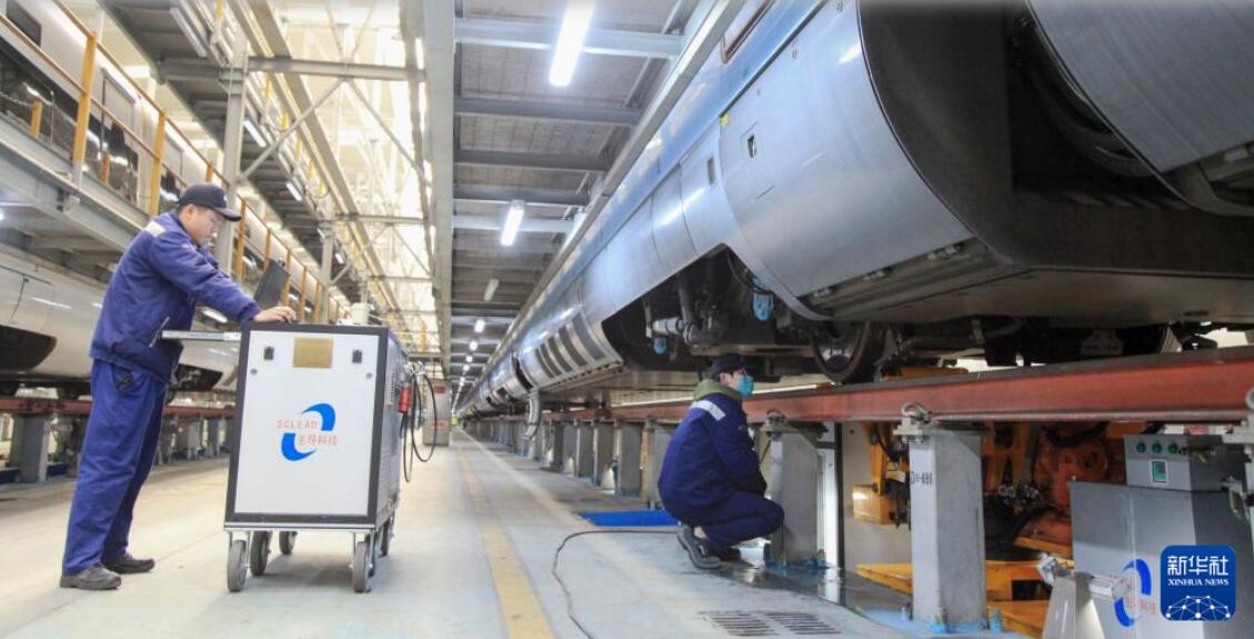 1月12日,工作人員在南京南動車運用所檢修車間檢修動車組列車。