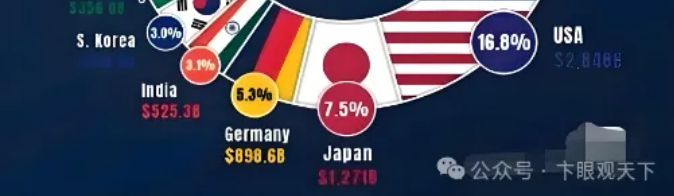 美國(guó)以2.4萬億美元位列第二,筆中國(guó)少一倍多,占全球制造業(yè)的約10%;