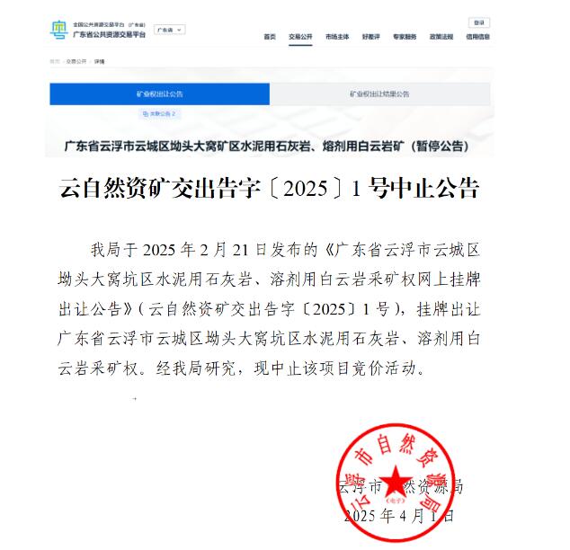 4月1日,廣東省云浮市自然資源局中止了云浮市云城區(qū)坳頭大窩坑區(qū)水泥用石灰?guī)r、溶劑用白云巖采礦權(quán)掛牌出讓競價活動。