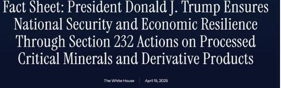 據白宮官網發布的說明,行政令要求美國商務部長根據1962年《貿易擴展法》的第232條款啟動調查,以評估美國進口關鍵礦產對美國安全和韌性的影響。