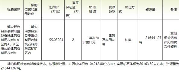 日前,廣西河池市都安縣人民政府發布安陽益梨吞晚建筑石料用灰巖礦礦區內A、B區堆放的建筑石料用灰巖礦第七次拍賣出讓公告。本次拍賣資源量21.64萬噸,起拍價55.05萬元,折合2.53元/噸。