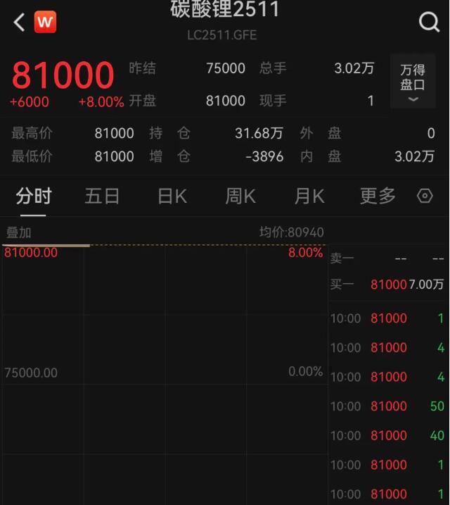 8月11日早盤開盤,碳酸鋰期貨所有合約均觸及漲停,其中主力合約(2511)漲幅8%,現(xiàn)報81000元/噸。創(chuàng)近三個月來新高。A股