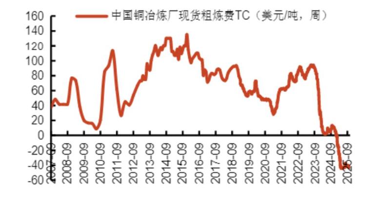 2025年,中國長單TC(粗煉費)已跌至歷史低位,現(xiàn)貨加工費甚至跌入負值區(qū)間,較此前高位降幅顯著,意味著冶煉企業(yè)從礦商處采購銅精礦加工時,不僅拿不到加工費,還得倒貼錢給礦商。
