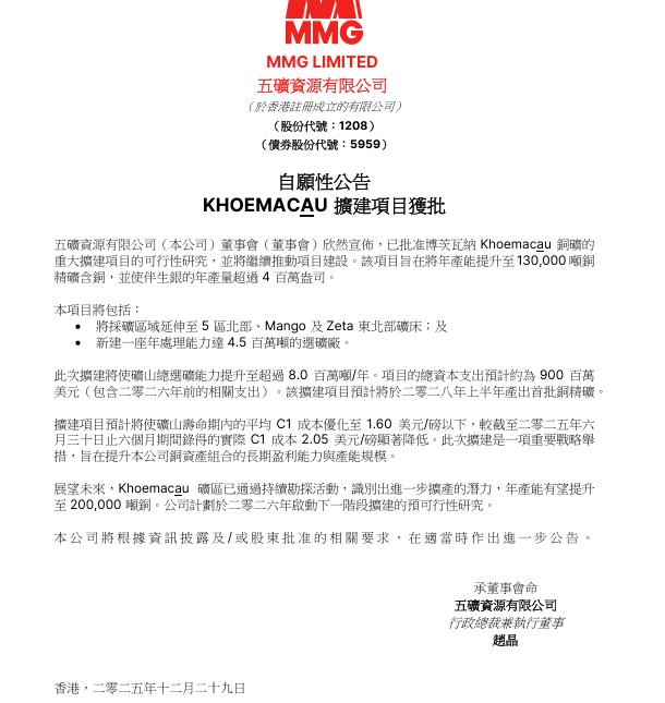 2025 年 12 月 29 日,中國(guó)礦業(yè)巨頭五礦資源(01208.HK)在港交所發(fā)布重磅公告,正式批準(zhǔn)博茨瓦納 Khoemacau 銅礦重大擴(kuò)建項(xiàng)目可行性研究并啟動(dòng)建設(shè)。