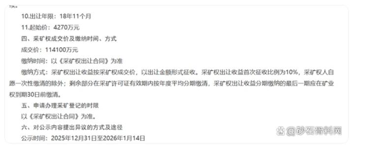 近日,河北邯鄲市自然資源和規(guī)劃局發(fā)布涉縣木井鄉(xiāng)土木河北坡建筑石料用灰?guī)r礦新增礦區(qū)范圍資源采礦權(quán)拍賣出讓交易結(jié)果公示。該項目起始價4270萬元,河北啟創(chuàng)瑞景建材科技有限公司11.41億元競得,溢價率高達2572%。該項目礦區(qū)出讓資源量1670.01萬方(4500萬噸),生產(chǎn)規(guī)模約240萬噸/年,出讓年限18.9年,折合噸成本25.3元。目前成交結(jié)果正處于公示期,公示時間從2025年12月31日至2026年1月14日。