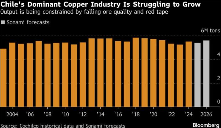 Riesco 周二在圣地亞哥告訴記者,作為促進增長議程的一部分,取消對投資的限制,可能釋放數十億美元的礦山擴建,這些項目將對產量產生顯著影響。據索納米稱,去年年產量降至 540 萬噸,今年預計將達到 550 萬噸至 570 萬噸。協會表示,高價格也可能沖擊更多供應。