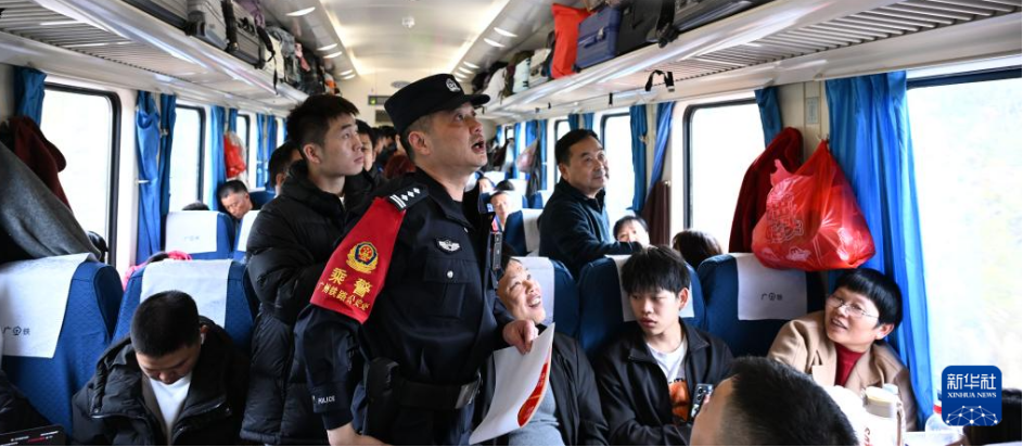 2月11日,在廣州白云站開往鄭州站的Z4190次列車上,乘警陳建軍(前)在列車上給乘客發放行李標識貼。