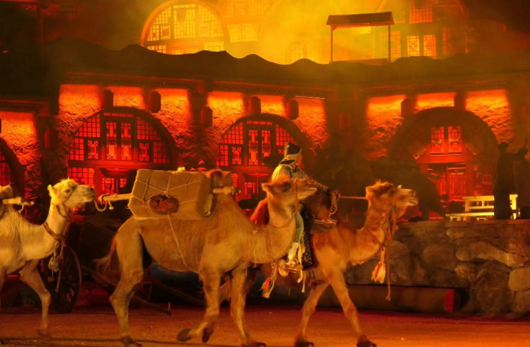 “出發嘍!”隨著駝夫號子響起,幾峰馱著貨物的駱駝從驛站前緩緩走過,后面跟著挑扁擔的貨郎和推小車的工匠。一支走西口的商隊,從歷史深處走來,走到莫尼山非遺小鎮,為游客呈現了一場沉浸式實景劇《莫尼山禮贊》。