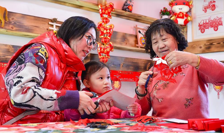 游客們在莫尼山非遺小鎮體驗剪紙。(呼和浩特市回民區融媒體中心供圖)