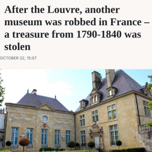 據外媒當地時間22日報道,在巴黎盧浮宮博物館發生搶劫案后不久,法國另一家小型博物館失竊,約2000枚金幣和銀幣被盜。事發后該博物館暫時關閉。