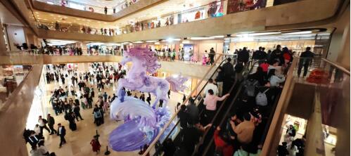 2月21日,南京德基廣場商場內(nèi)人潮涌動,商場一層矗立的馬年主題生肖裝置格外引人注目。新華社記者潘曄 攝